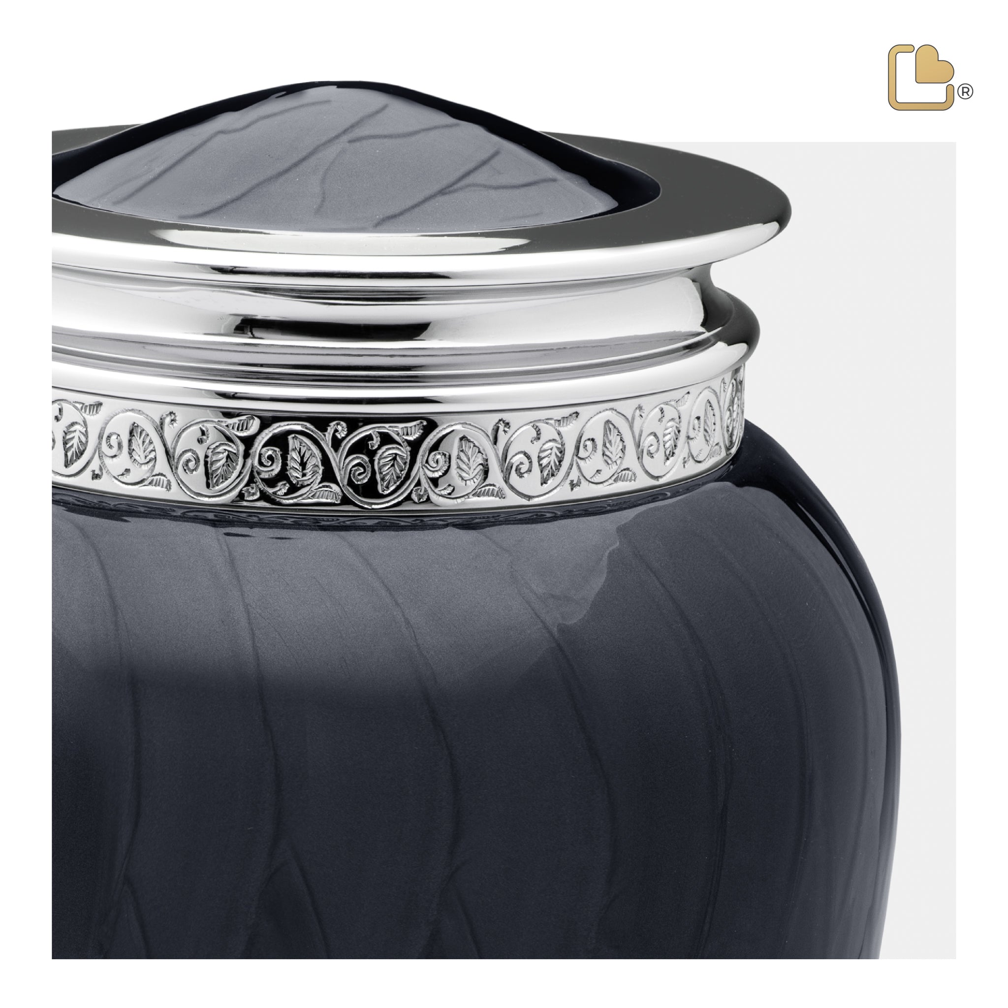 The adult funeral urn is masterfully hand-crafted from top-quality brass alloy and can hold up to 238 cu. inches of ashes. Its rich, obsidian color symbolizes the depth of night, evoking thoughts of the unknown, or even peaceful solitude. The urn’s top contrasts beautifully with its midnight hues, featuring a sterling silver finish engraved with delicate vine motifs. This silver accent enhances the overall aesthetic of this sacred space, representing purity and remembrance, while also highlighting the beauty found in life’s transitions.