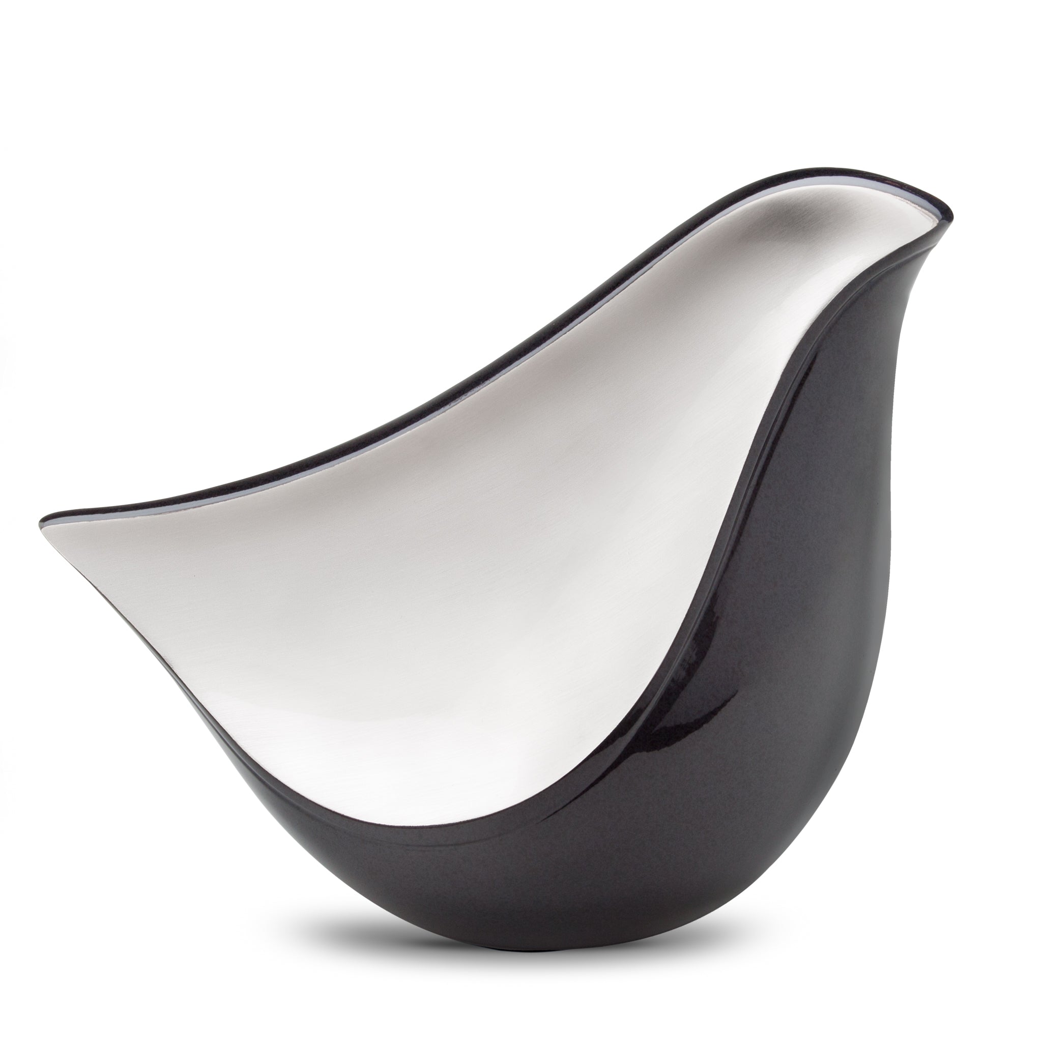 This cremation urn takes on the shape and outline of a bird, with a round body and pointed beak and tail. The bird has a two-tone finish, with a sharp, black enamel coating the outer body of the bird, which contrasts with the brushed silver finish on the interior portion. Since it has a non-traditional urn shape, it is different and unique, and the bird’s form reminds us of peace, love, spirituality, and freedom of spirit.