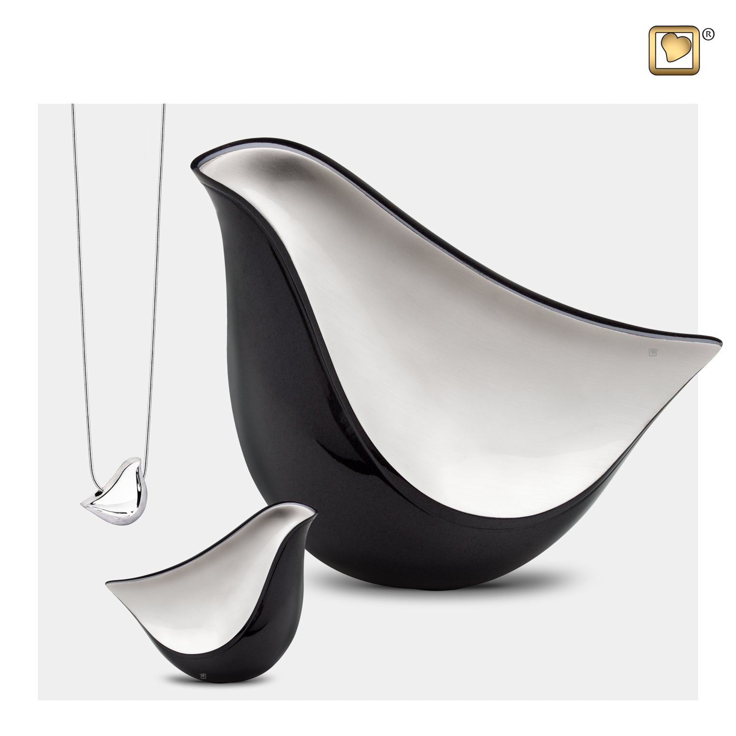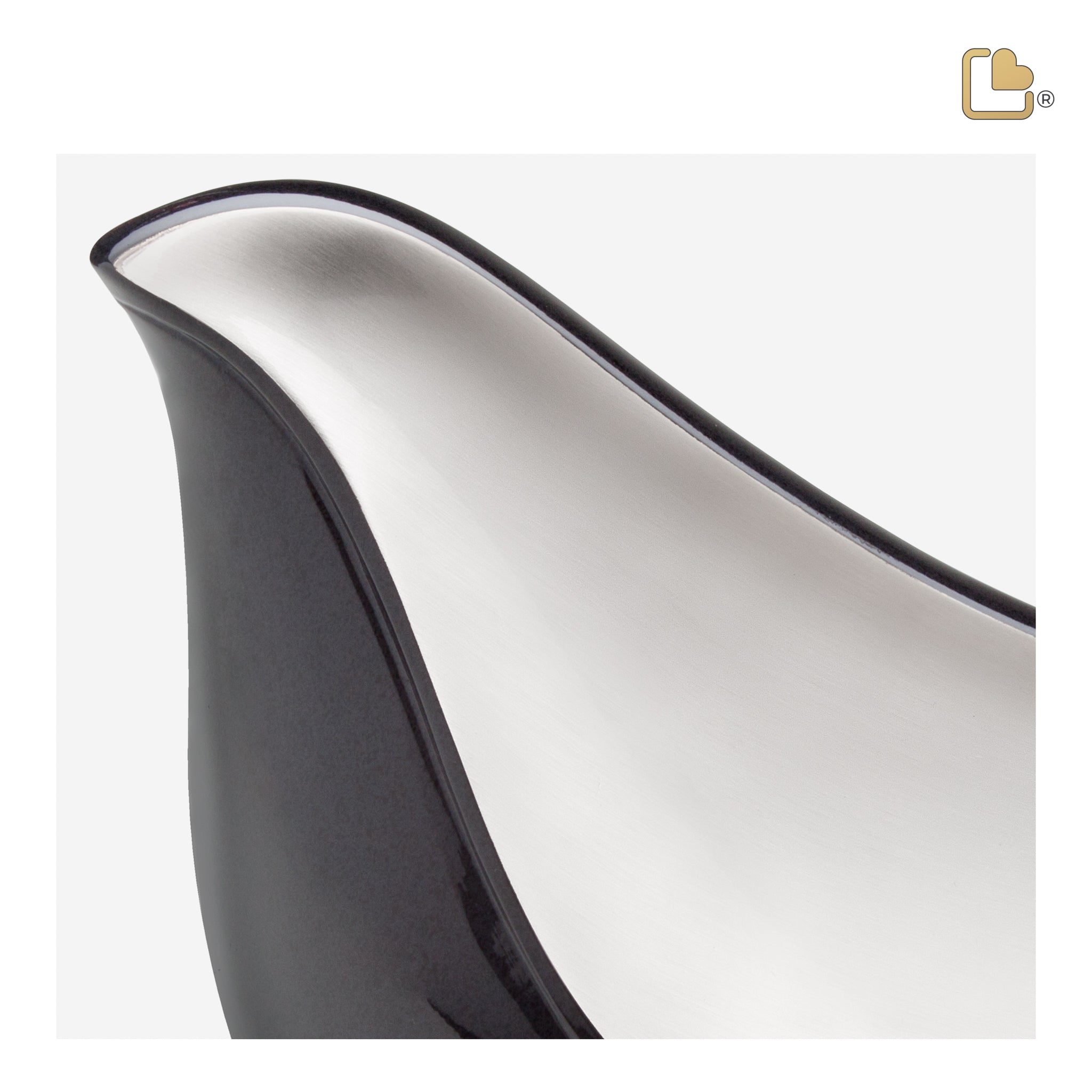 This cremation urn takes on the shape and outline of a bird, with a round body and pointed beak and tail. The bird has a two-tone finish, with a sharp, black enamel coating the outer body of the bird, which contrasts with the brushed silver finish on the interior portion. Since it has a non-traditional urn shape, it is different and unique, and the bird’s form reminds us of peace, love, spirituality, and freedom of spirit.