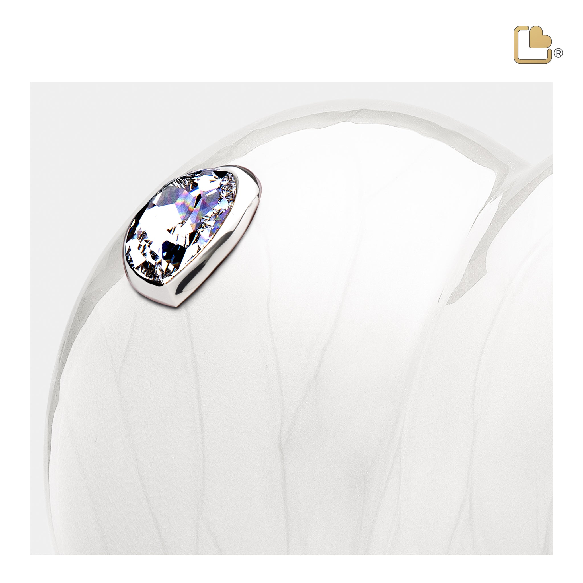 The LoveHeart Standard Adult Urn in Pearl White & Polished Silver with Crystal is a striking tribute to a beloved individual. The pearl-white color symbolizes purity, peace, and eternal love, creating a serene environment for remembrance. The Polished silver elements represent sophistication and grace, while the delicate crystal accent adds a touch of sparkle and beauty, signifying the cherished memories that shine bright in our hearts.