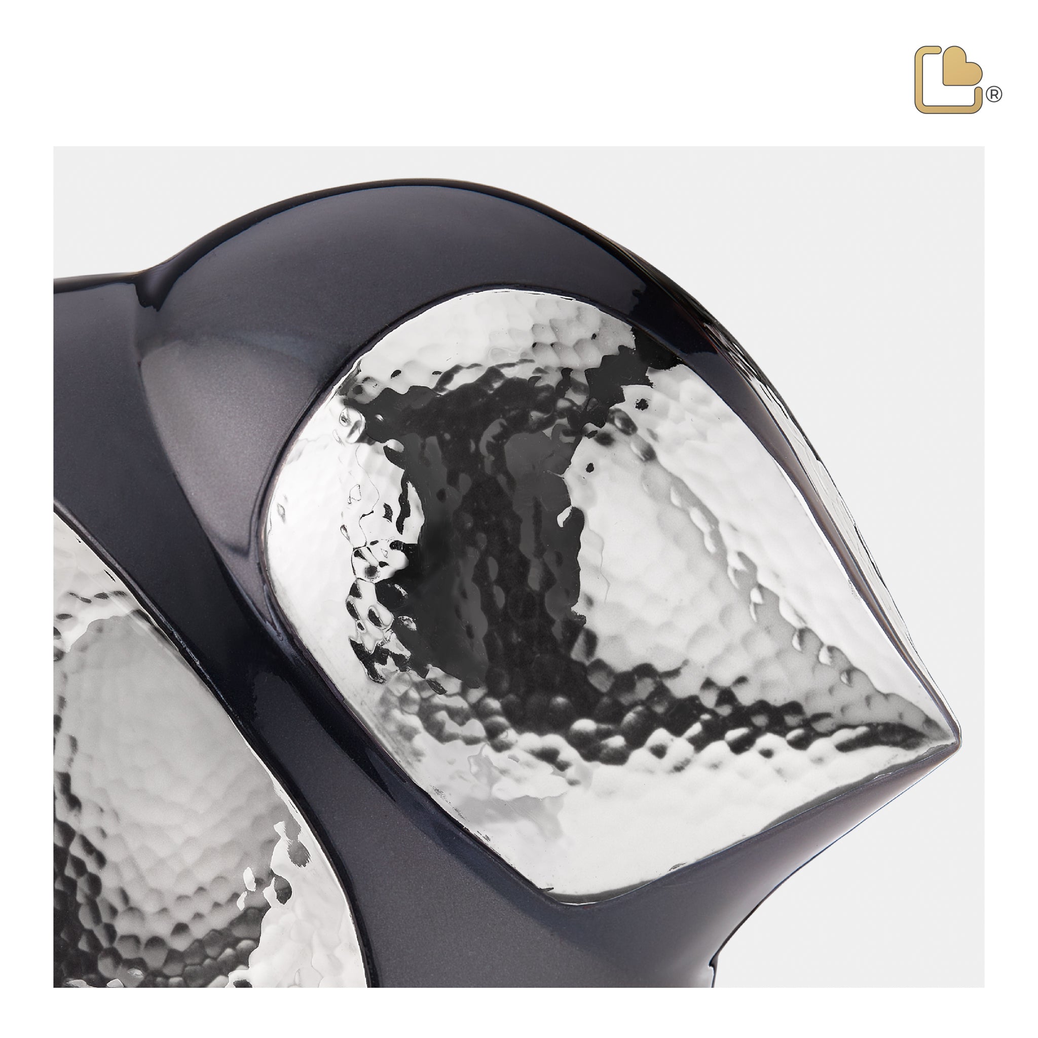 Though the bird is simplistic by nature, there is added depth through the texturing of hammered silver which outlines the wings and face of the bird. Surrounding the silver is a deep, rich, dark ebony glaze, which has a smooth finish that contrasts perfectly with the hammered silver.