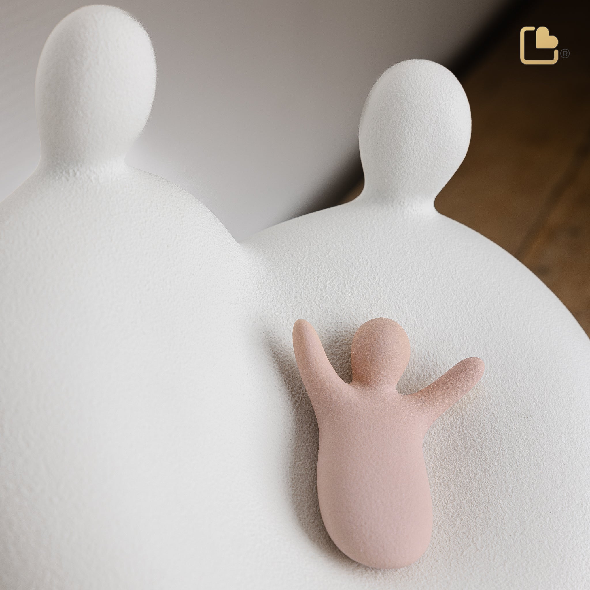 While some lives are short, they are never small. We wish to capture every tiny bit of your child’s existence. With this in mind, we designed this small child cremation urn that represents the parents or caretakers embracing their beloved child in the form of an artistic sculpture. The small pink child has arms lifted symbolizing an eternal appreciation for the life given to those closest whose love will continue forevermore.