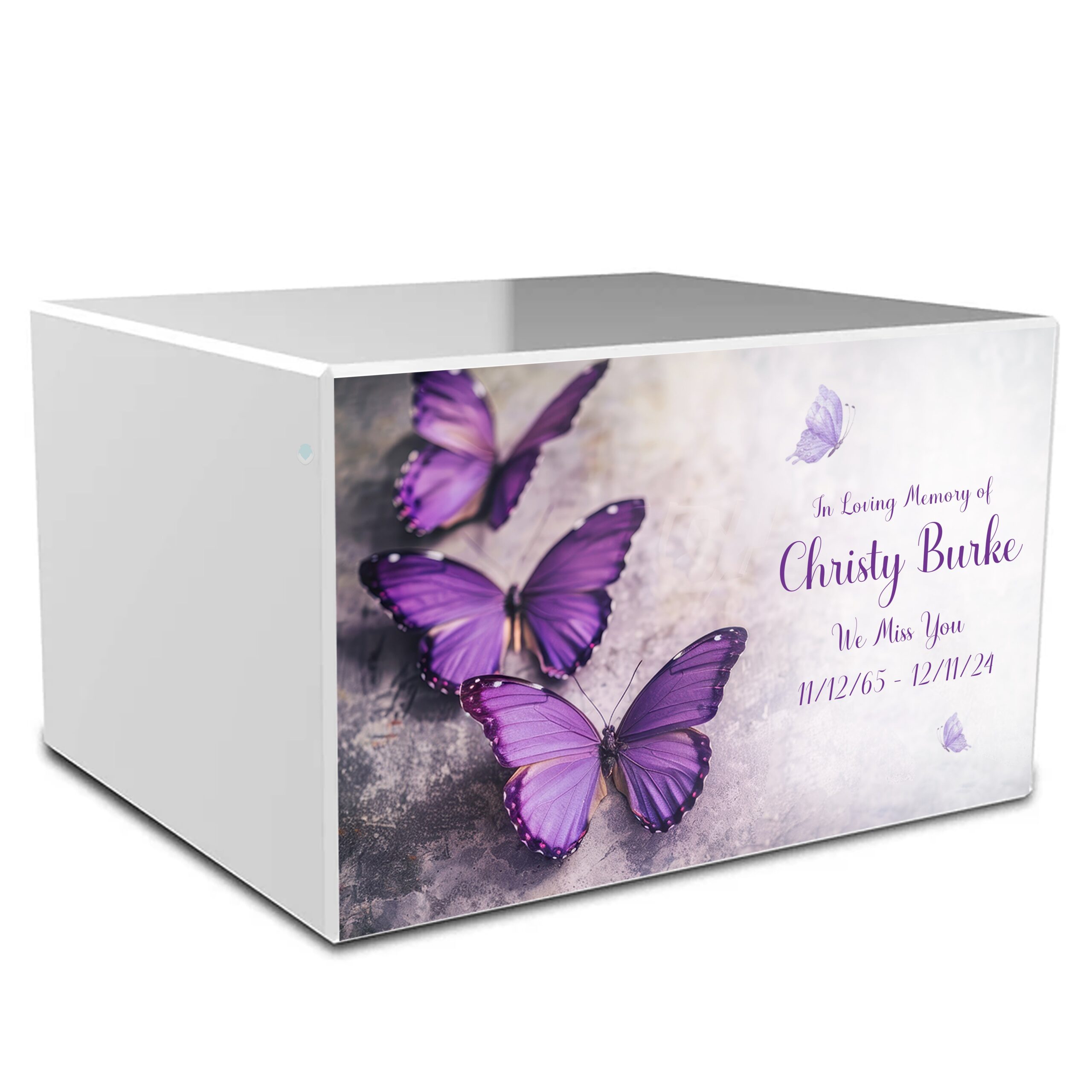 The Custom Printed Heritage Butterflies White Wood Box Cremation Urns are elegant and modern in design. This Heritage Urn for ashes displays a line of vibrant colored butterflies ascending in flight towards the sky.