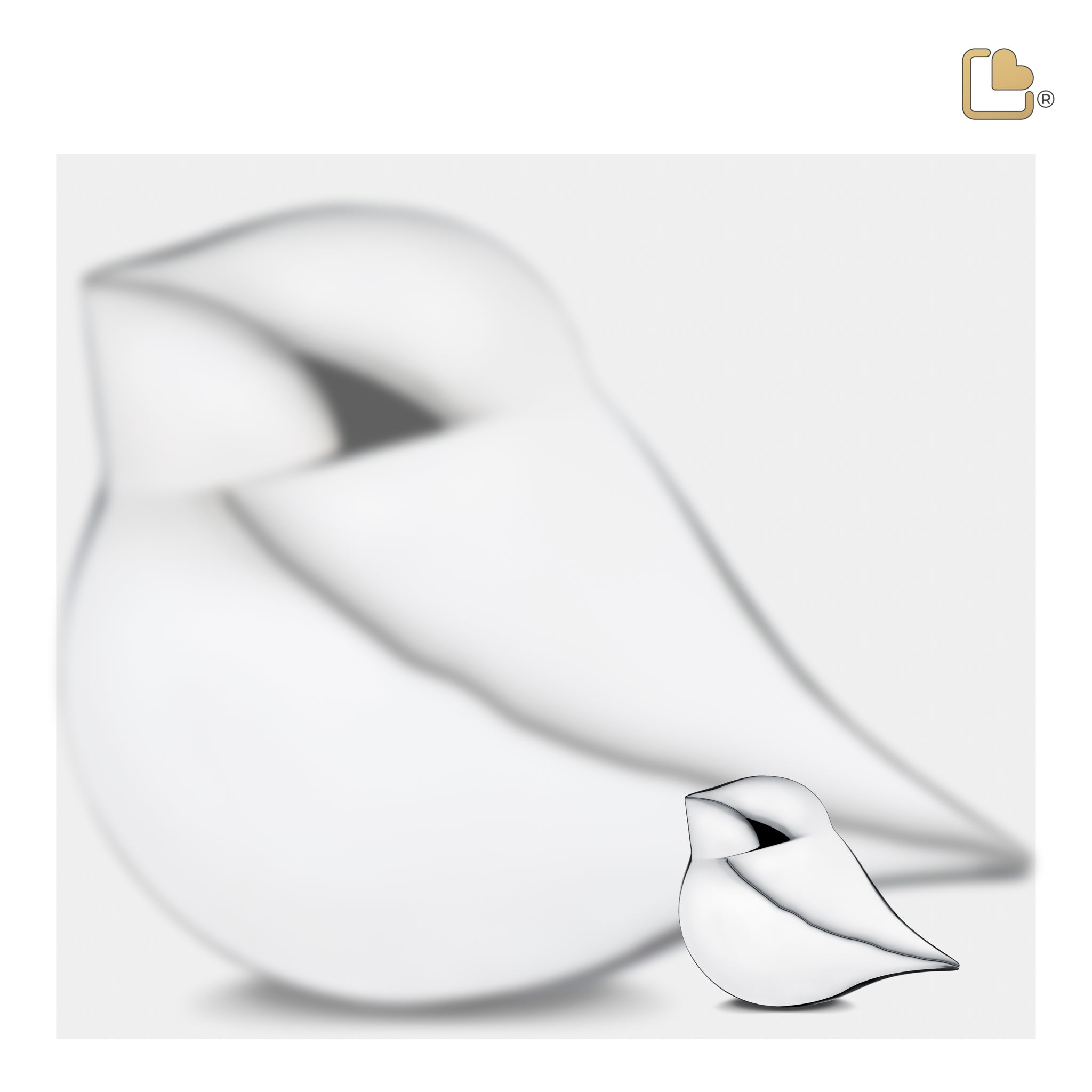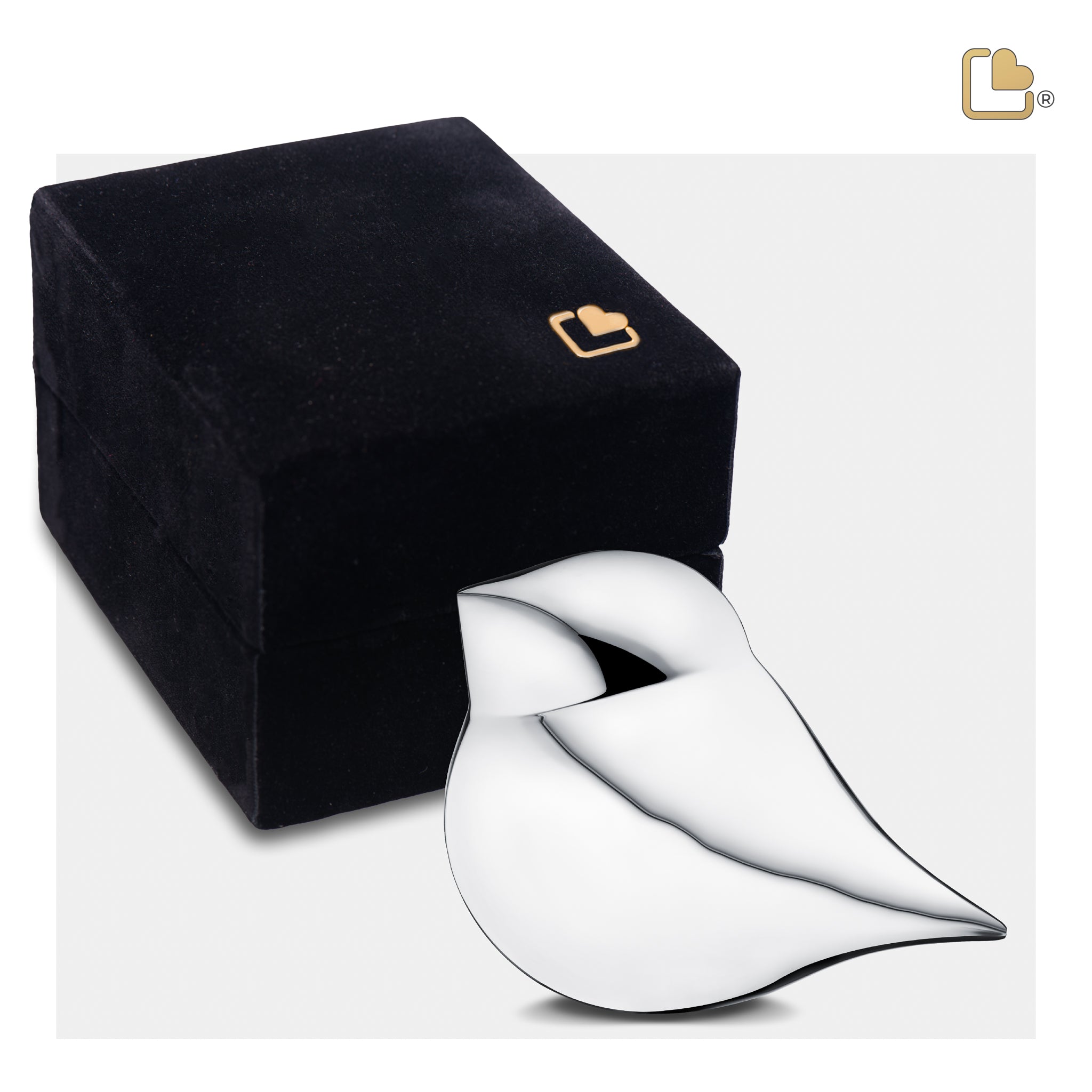 The Keepsake Silver SoulBird Male cremation urn is both chic and stylish with its streak-free, non-tarnished silver body. The entire bird is a solid shade of vibrant, smooth, brass that is coated in a polished silver surface finish which catches the light and has an almost mirrored effect.