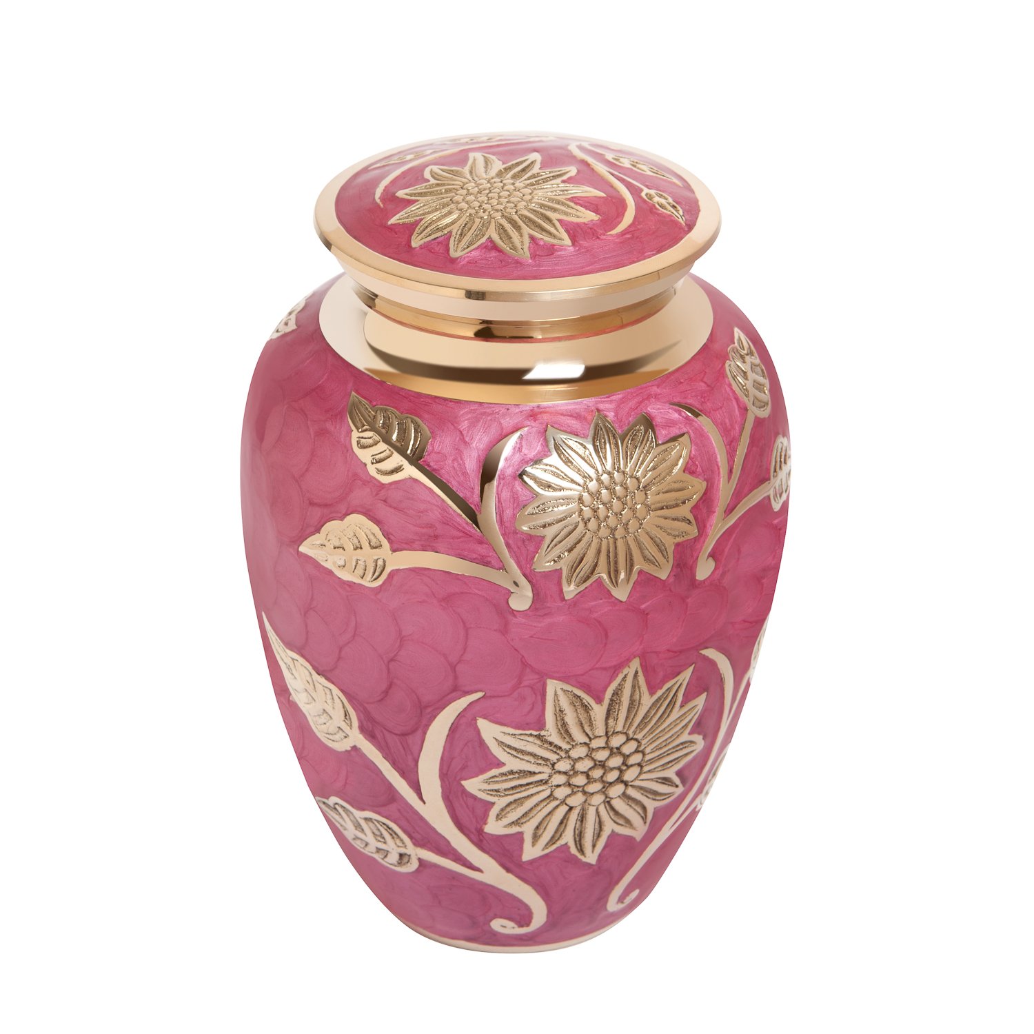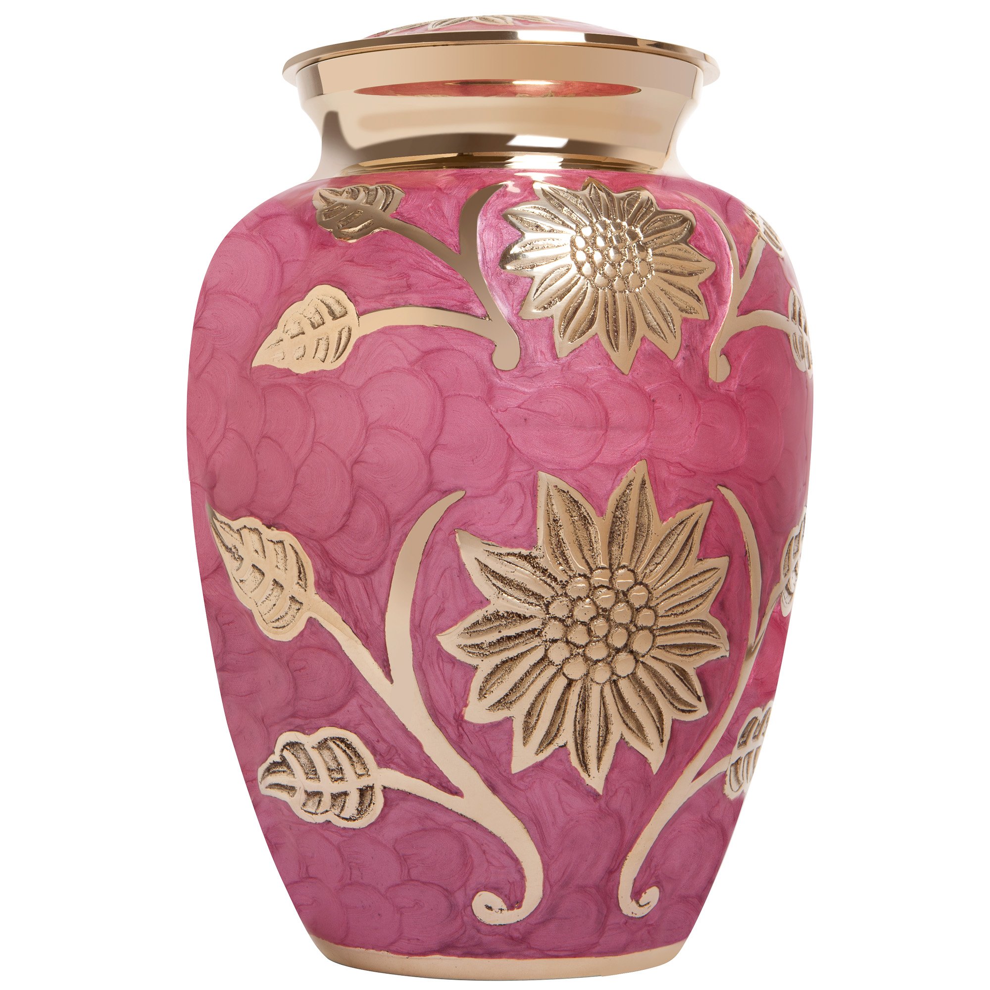 The Pink Flower Funeral Urn by Liliane Memorials is a beautifully handcrafted brass urn designed to hold the remains of adults weighing up to 200 lbs. Measuring 10.2 inches in height and 7.4 inches in width, it features a secure threaded screw top and a felt-covered bottom for added protection. Each urn is thoughtfully packaged in a plush bag, making it a dignified choice for memorialization.