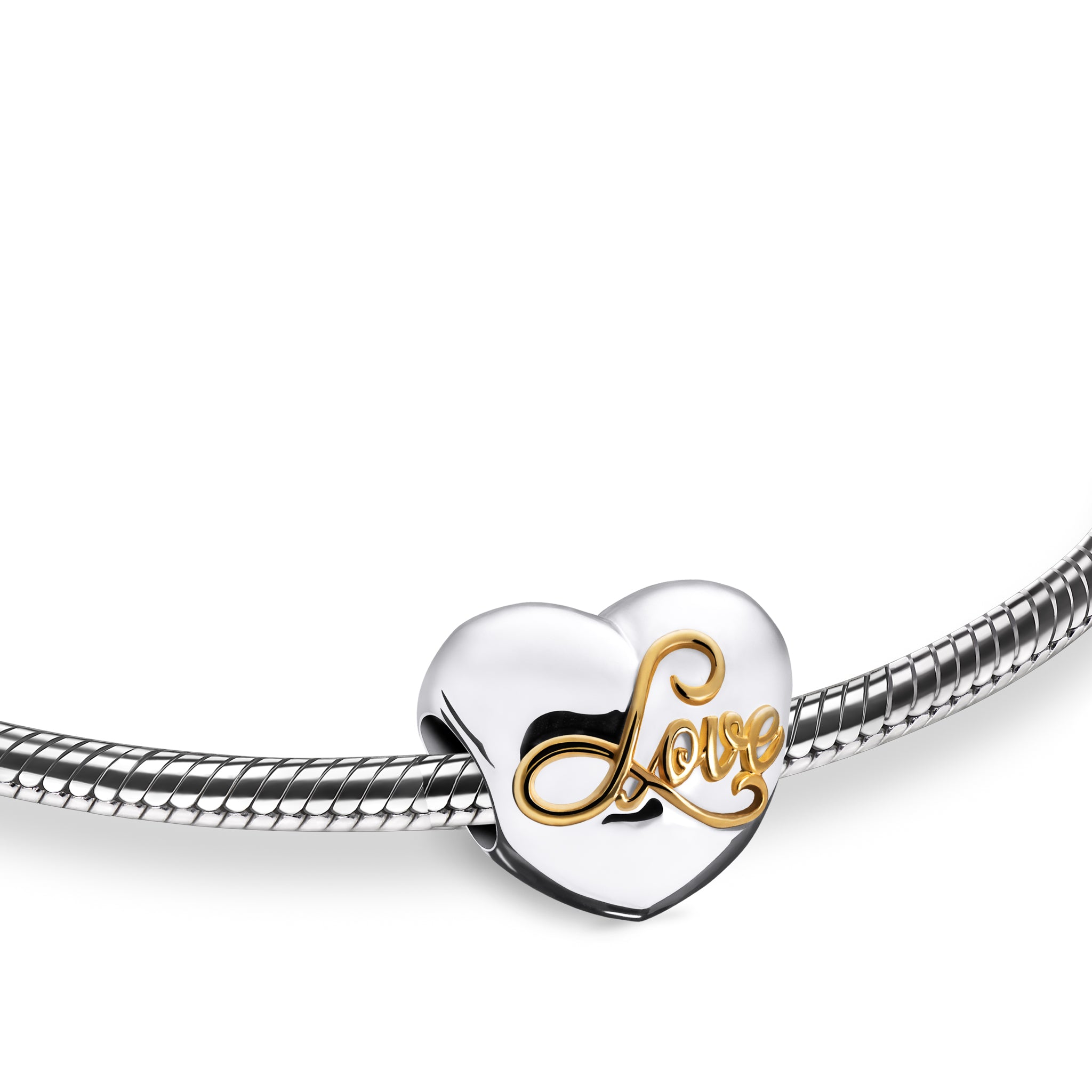 The bead itself is crafted from 925 sterling silver, but coated with rhodium plating for added brilliance and protection. The lettering on the surface is done in gold vermeil, which is a high-quality gold plating that gracefully coats the silver, bringing a dazzling contrast between the silver and gold tones.