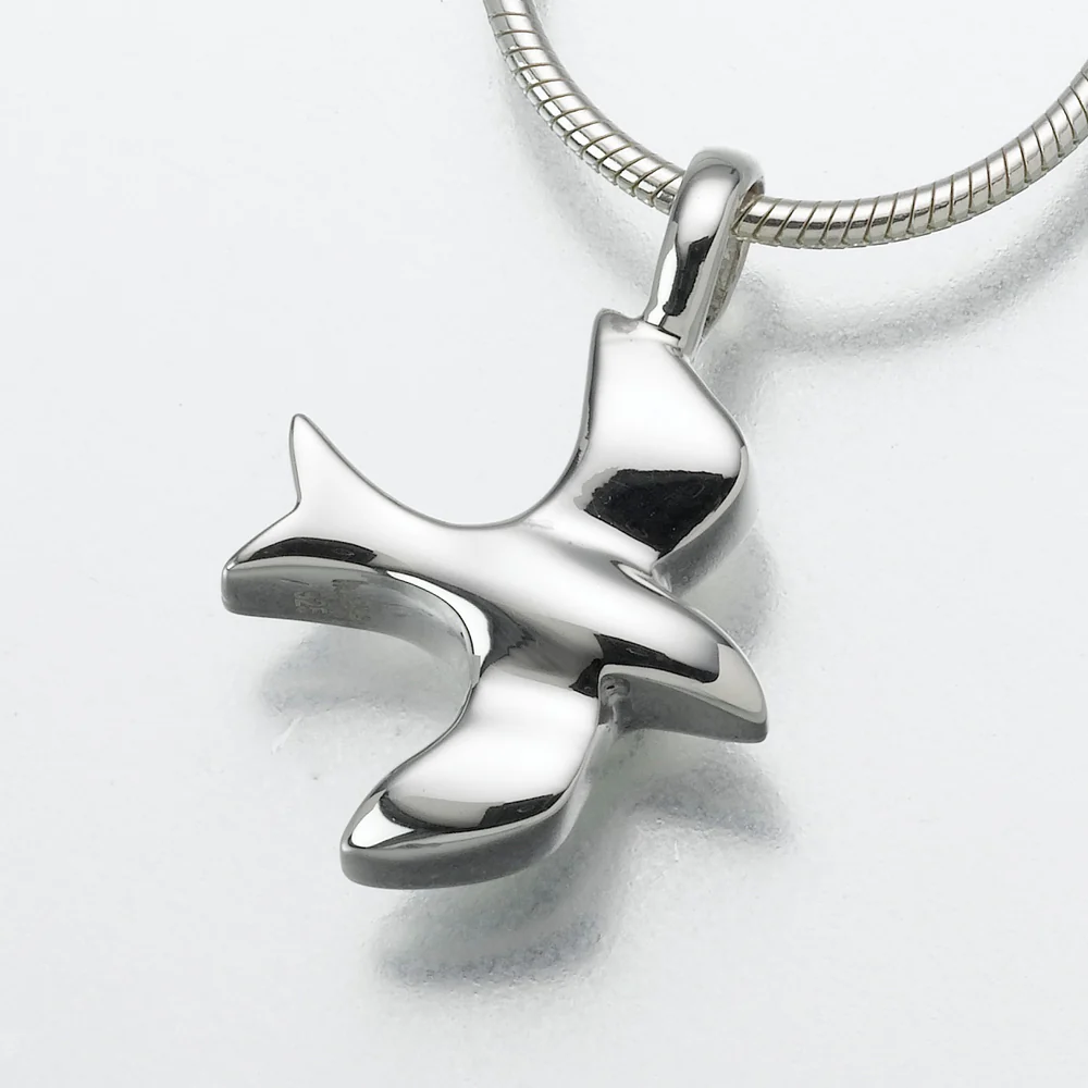The dove of peace has a high polish finish with a threaded screw on back. It is a popular piece to hang on our 164SS-B chain link bracelet. (Smaller fillable chamber) Each piece of cremation jewelry can hold a small amount of cremation ashes.